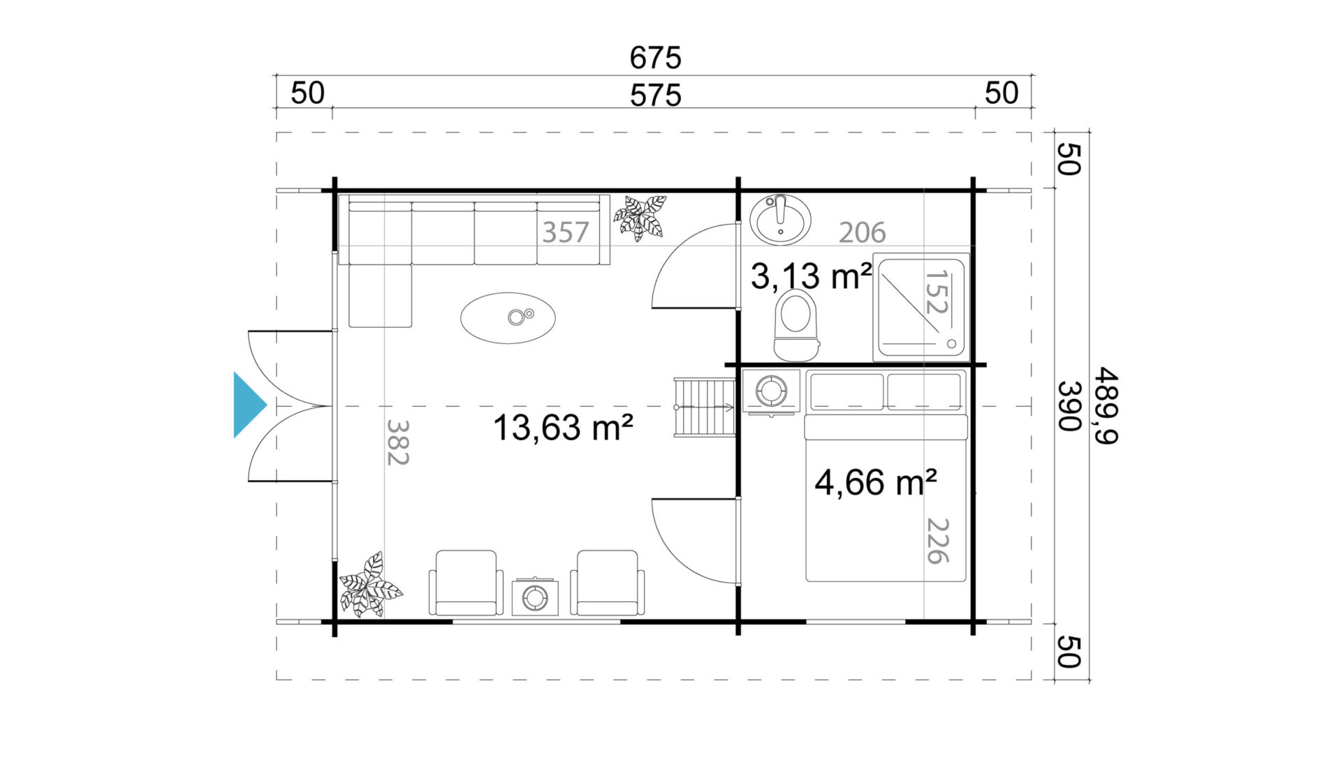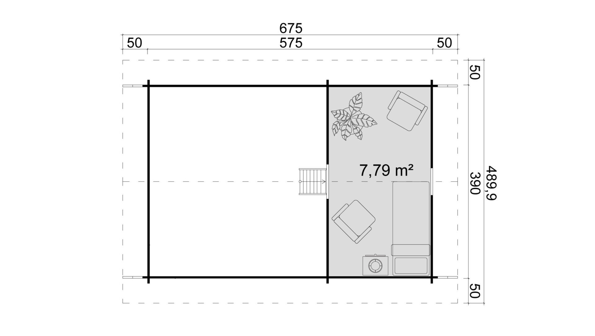 Põrandapind 29.20 m²Ehitisealune pind: 22.40 m²Katuse pindala: 37.12 m²Katuse kalle: 27Seina paksus 40 mmAlusraam: 45 x 70 mmPõrandalaua paksus: 18,5 mmKatuselaua paksus: 18,5 mmVundament 390 x 575 cmLaius koos räästa üleulatuvusega: 675 cmSügavus koos räästa üleulatuvusega: 490 cmSeina kõrgus: 239 cmHarja kõrgus: 331 cmKatuse üleulatuvus eest: 50 cmKatuse üleulatuvus külgedelt: 50 cmKatuse üleulatuvus tagant: 50 cmUkse tüüp GoldUkse mõõdud: 835 x 1900 mm