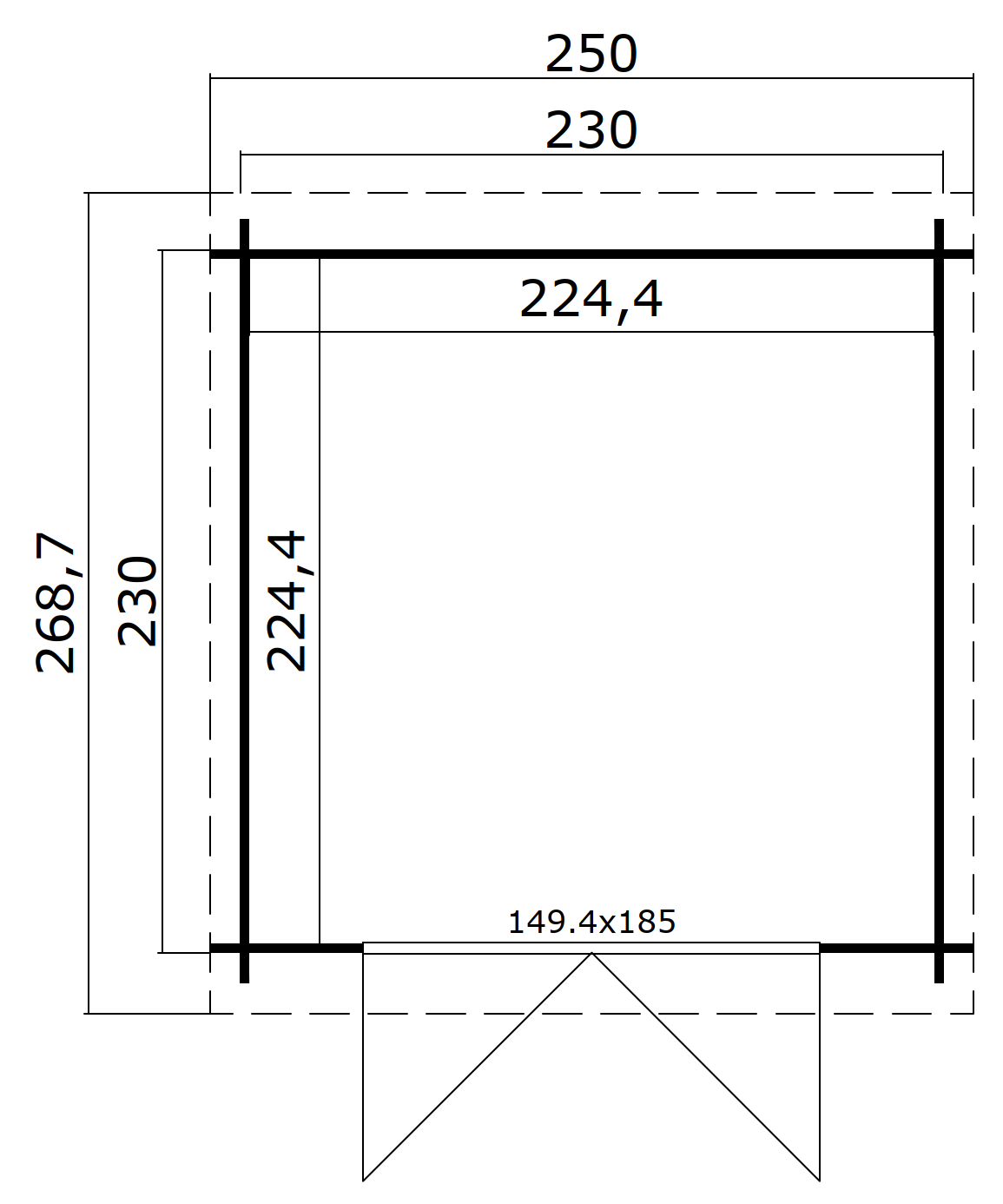 Põrandapind 5.04 m²Ehitisealune pind: 5.29 m²Katuse pindala: 6.75 m²Katuse kalle: 5.7Seina paksus 28 mmAlusraam: -Põrandalaua paksus: -Katuselaua paksus: 15,5 mmVundament 230 x 230 cmLaius koos räästa üleulatuvusega: 250 cmSügavus koos räästa üleulatuvusega: 269 cmSeina kõrgus: 188 cmHarja kõrgus: 211 cmKatuse üleulatuvus eest: 20 cmKatuse üleulatuvus külgedelt: 10 cmKatuse üleulatuvus tagant: 19 cmUkse tüüp BronzeUkse mõõdud: 1494 x 1850 mmUkse klaasi paksus: 4Ukse klaasi tüüp: Ühekordne klaasPaigaldatav peegelpildis: JahViimistlus: ViimistlemataVärvitoon: NaturaalneKonstruktiivne materjal: FeesprussNurga tüüp: Tapitud nurkMaterjal: Põhjamaine kuuskLumekoormus: 183 kg/m²